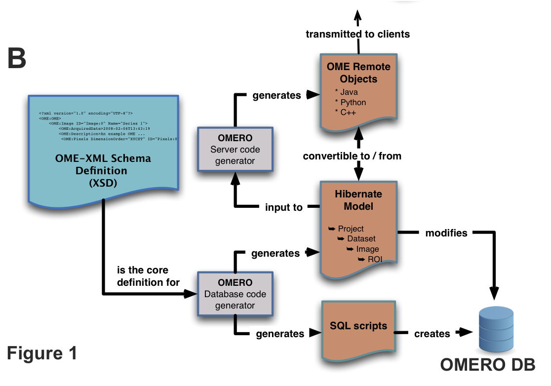 Because of its complexity, the object model is generated from a central definition using our own code-generator. It relies on no libraries and can be used in both the server and the RMI clients. The relationships among the objects are enumerated in a cross-referenced reference document. OMERO.blitz uses a second mapping to generate OMERO Java language bindings, OMERO Python language bindings, and OMERO C++ language bindings classes, which can be mapped back and forth to the server object model. This document discusses only the server object-model and how it is used internally.