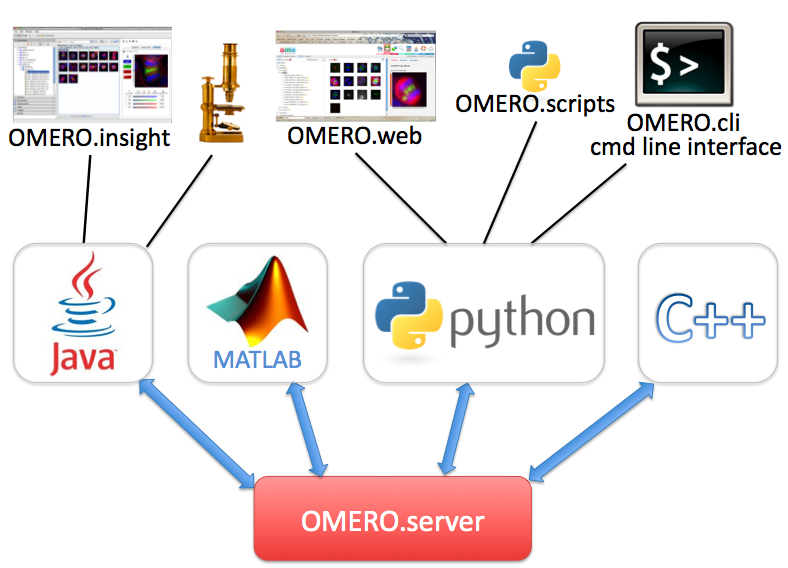 OMERO is an open source client/server system written in Java for visualizing, managing, and annotating microscope images and metadata. The OMERO Application Programming Interface allows clients to be written in Java, Python, C++ or MATLAB. OMERO releases include a Java client OMERO.insight, a Python-based web client OMERO.web and the Command Line Interface as an OMERO development tool, which also uses Python. There is also an ImageJ plugin. OMERO can be extended by modifying these clients or by writing your own in any of the supported languages (see figure). OMERO also supports a Scripting Service which allows Python scripts to be run on the server and called from any of the other clients.