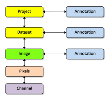 Images in OMERO are organized into a many-to-many container hierarchy: “Project” -> “Dataset” -> “Image”. These containers (and various other objects) can be annotated to link various types of data. Annotation types include Comment (string), Tag (short string), Boolean, Long, Xml, File attachment etc.